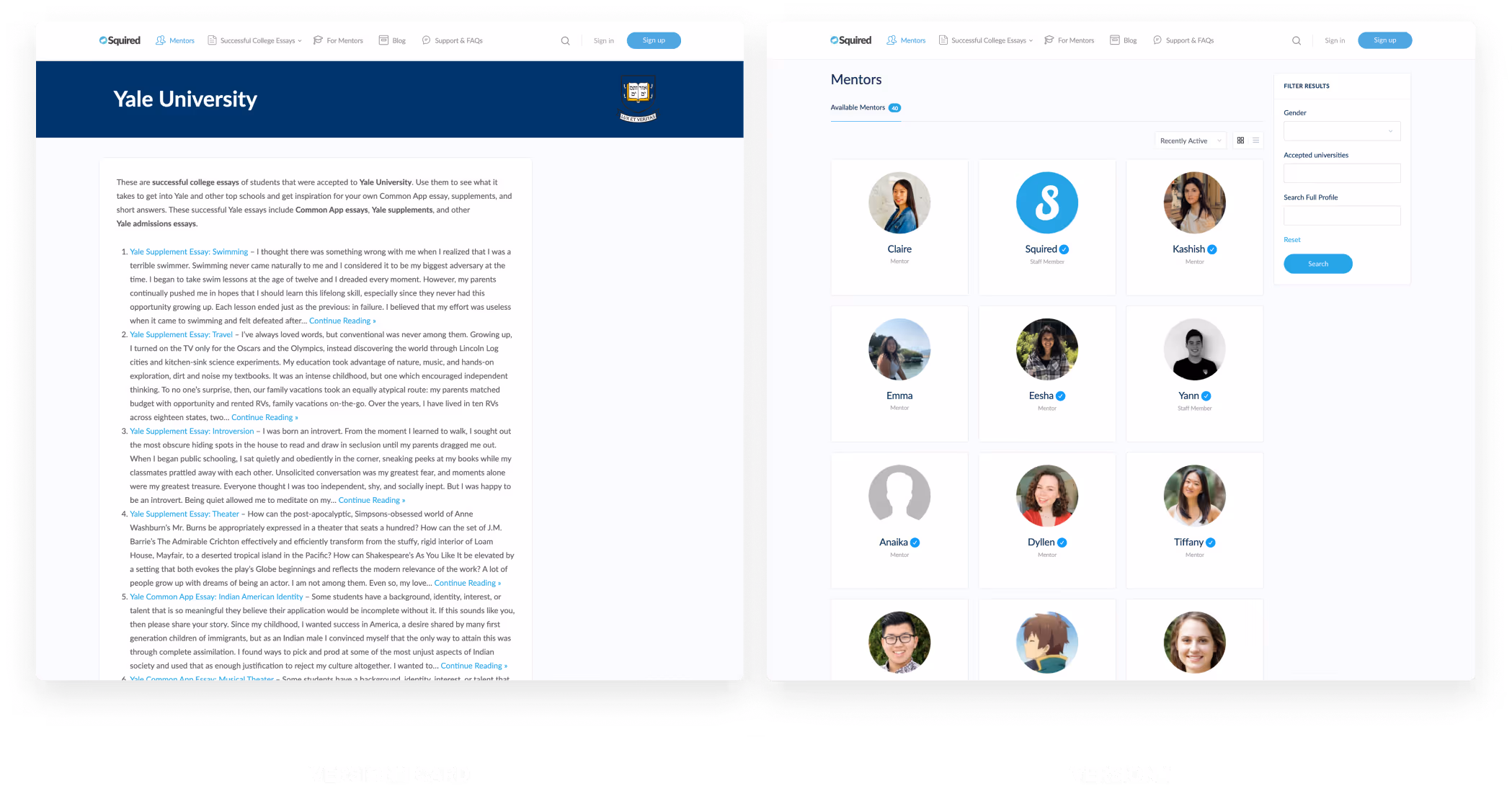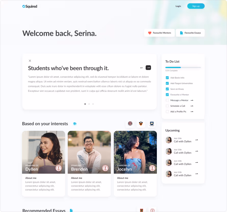 As the Head of Product, I owned and led the product design and strategy Squired, building it up from what once was just a simple static website hosting successful college essays, towards a fully-fledged, dynamic platform and community of students and mentors of diverse backgrounds and experiences. As of 2024, I am proud to say thta Squired has created over 70,000 student-mentor connections, and has reached over 2 million users online,