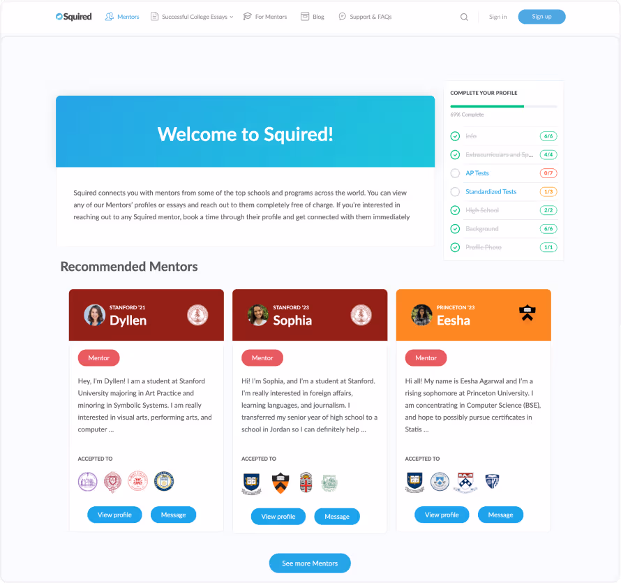 In 2019, I cofounded Squired - a platform that connects students applying to competitive universities with mentors who have been through the process themselves, to offer help and advice with the college application process. Mentors offer essay editing, feedback, interview prep, and guidance from first hand experience at a rate significantly below traditional college consultants.